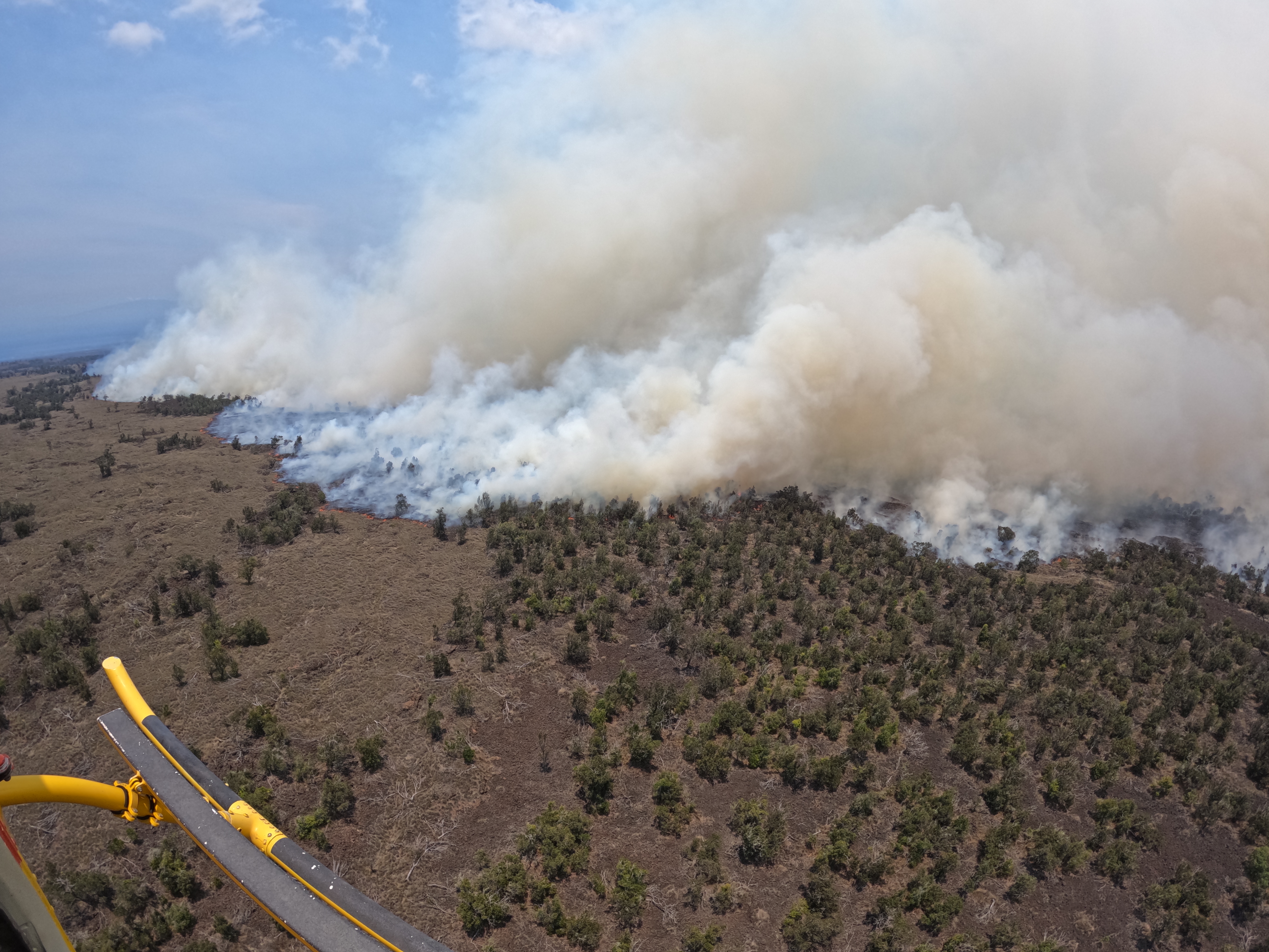 The fire spread has slowed in sparse grass on a ‘A’a lava flow in ohia forest. Containment and control remains dependent on fire behavior, wind, and difficult terrain.