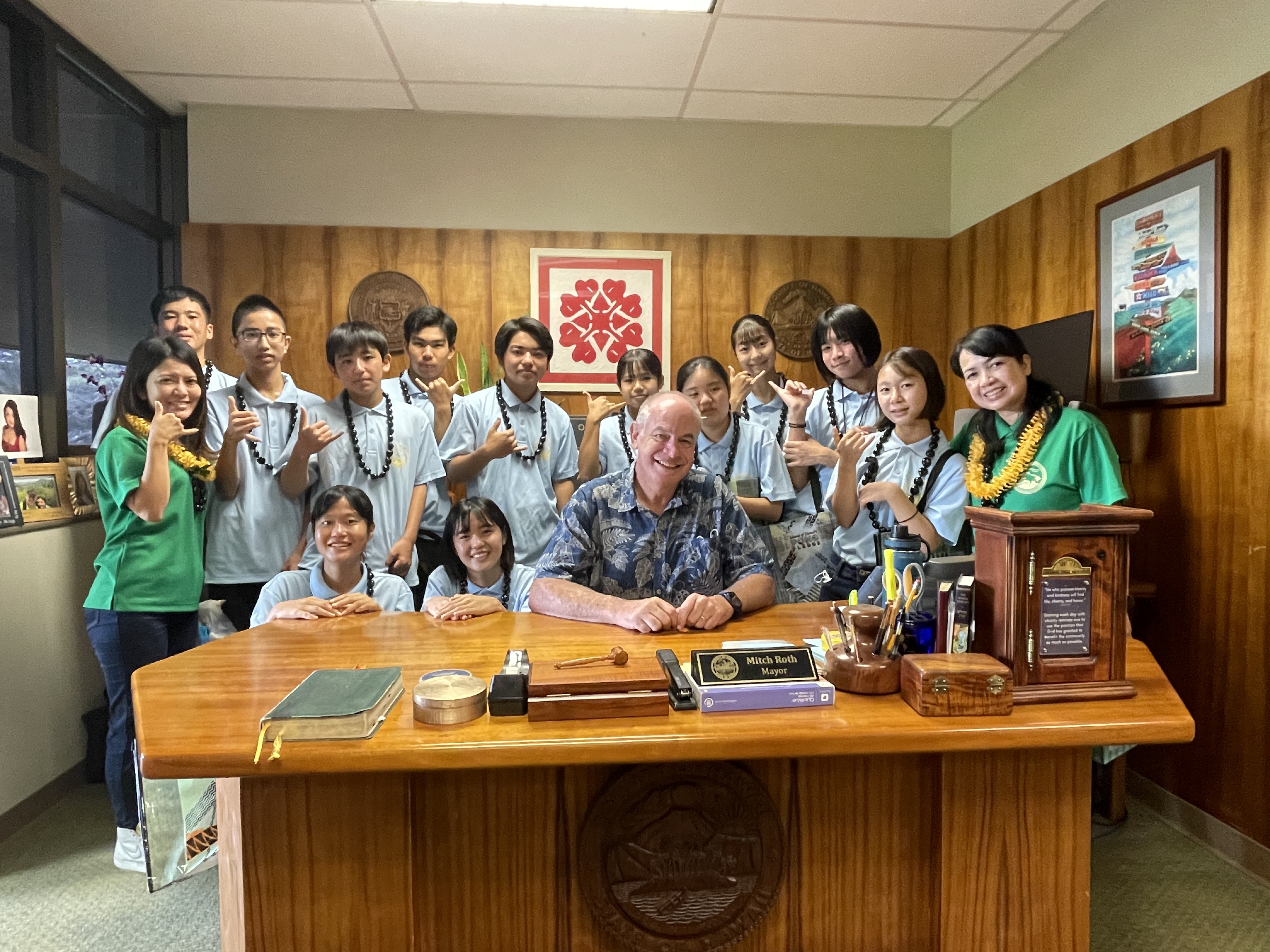 The students were selected from four middle schools in Nago City as part of an ongoing exchange to sharpen their English-speaking skills by having the opportunity to speak to native English speakers and learn about Hawaiian culture.