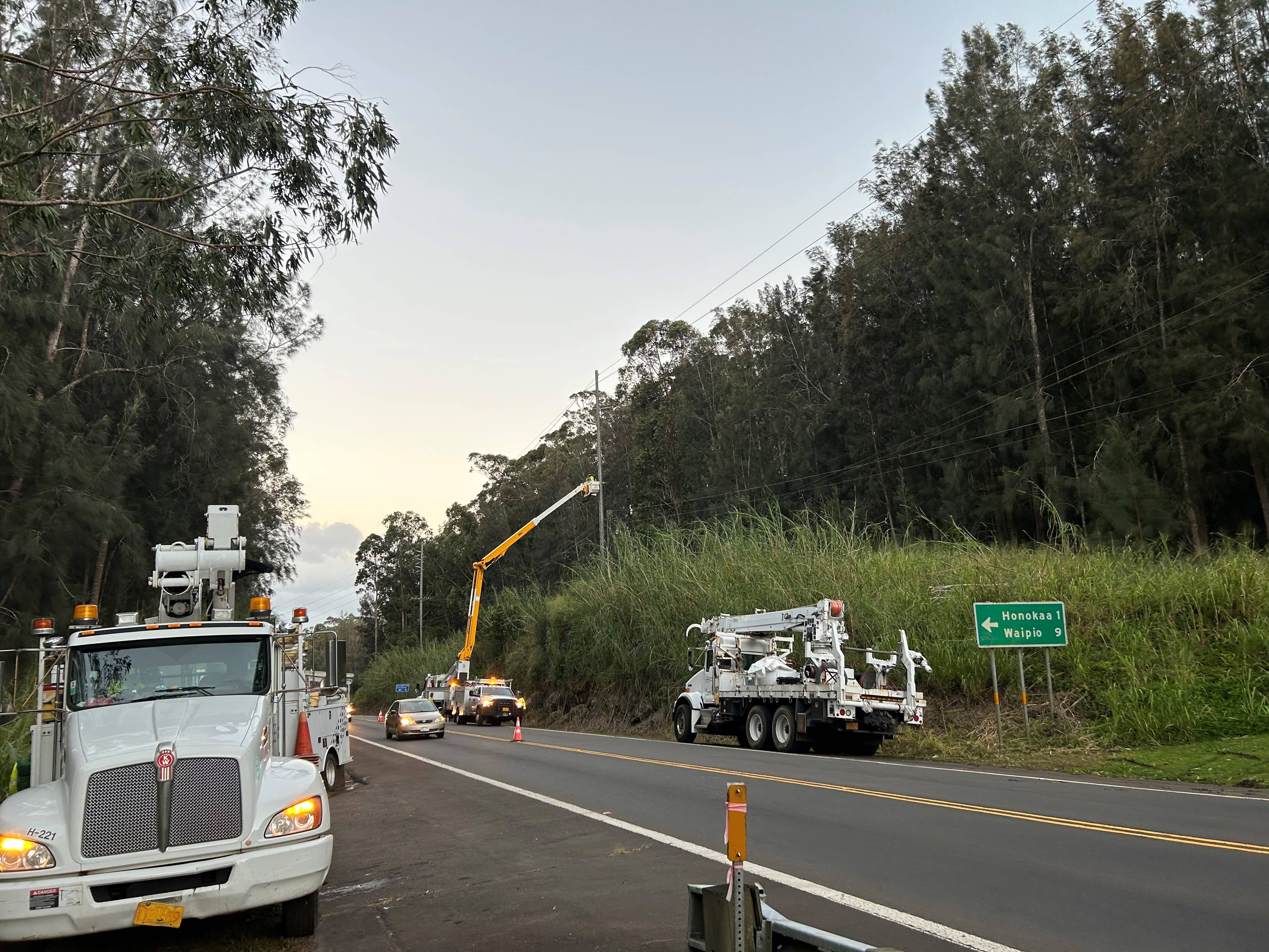 Crews from Hilo, Waimea and Kona have been working around the clock to repair damage caused by gusty winds and fallen trees. Additional crews from O‘ahu will also help with repairs. All transmission lines have been restored and are back in service.